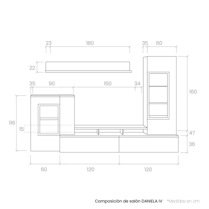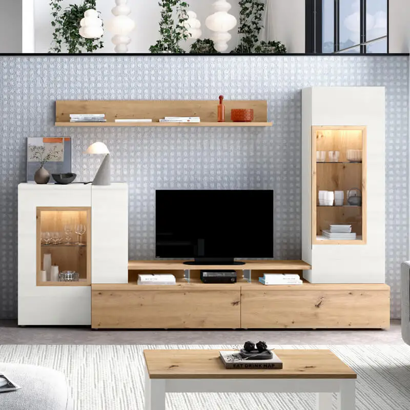 Composici贸n de sal贸n compuesta por un mueble de televisi贸n formado por dos m贸dulos , uno con puerta y el otro con caj贸n, incluye un soporte tv con soportes de cristal,un estante de pared 180, una vitrina baja con puerta madera y otra de cristal y una vitrina de grandes dimensiones con cristal para su almacenaje.