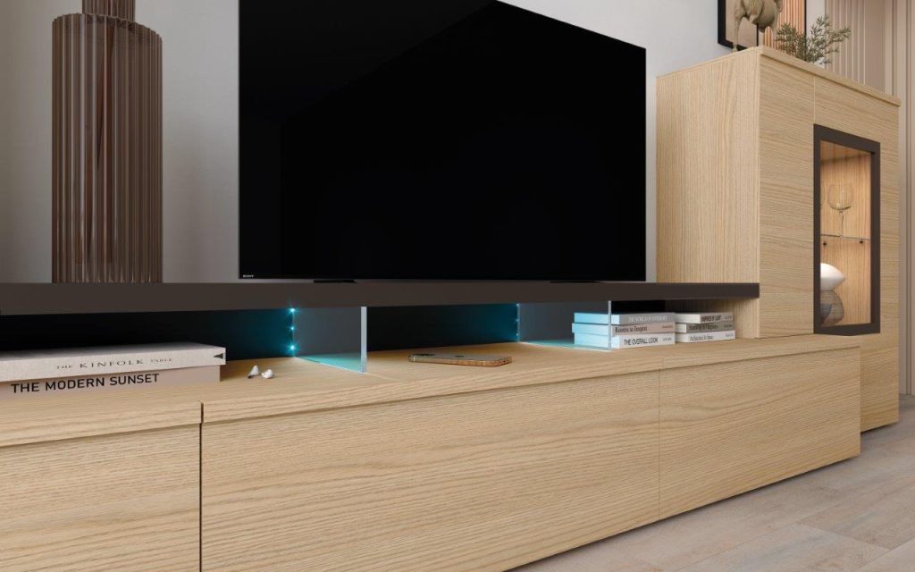 El mueble de sal贸n cuenta con un amplio espacio de almacenamiento, que permite mantener organizada la sala de estar y tener todos los elementos importantes al alcance de la mano. Entre los m贸dulos que lo conforman, encontramos m贸dulos bajos , estanter铆as y vitrinas. Adem谩s, cuenta con un espacio especial para colocar el televisor y otros dispositivos multimedia.