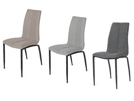 Silla industrial Ronda tapizada en tela tipo lido en colores BEIGE , GRIS Y GRIS OSCURO con costura transversal en respaldo y asiento. Patas metálicas de tubo cuadrado estilizadas en la base de color Negro mate.